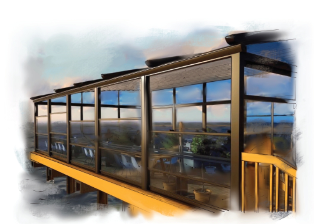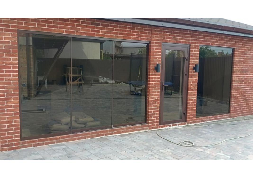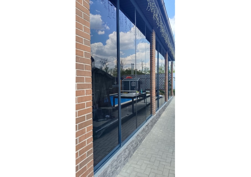 Алюминиевый профиль и стекло с возможностью раздвижения и открывания большой части проема